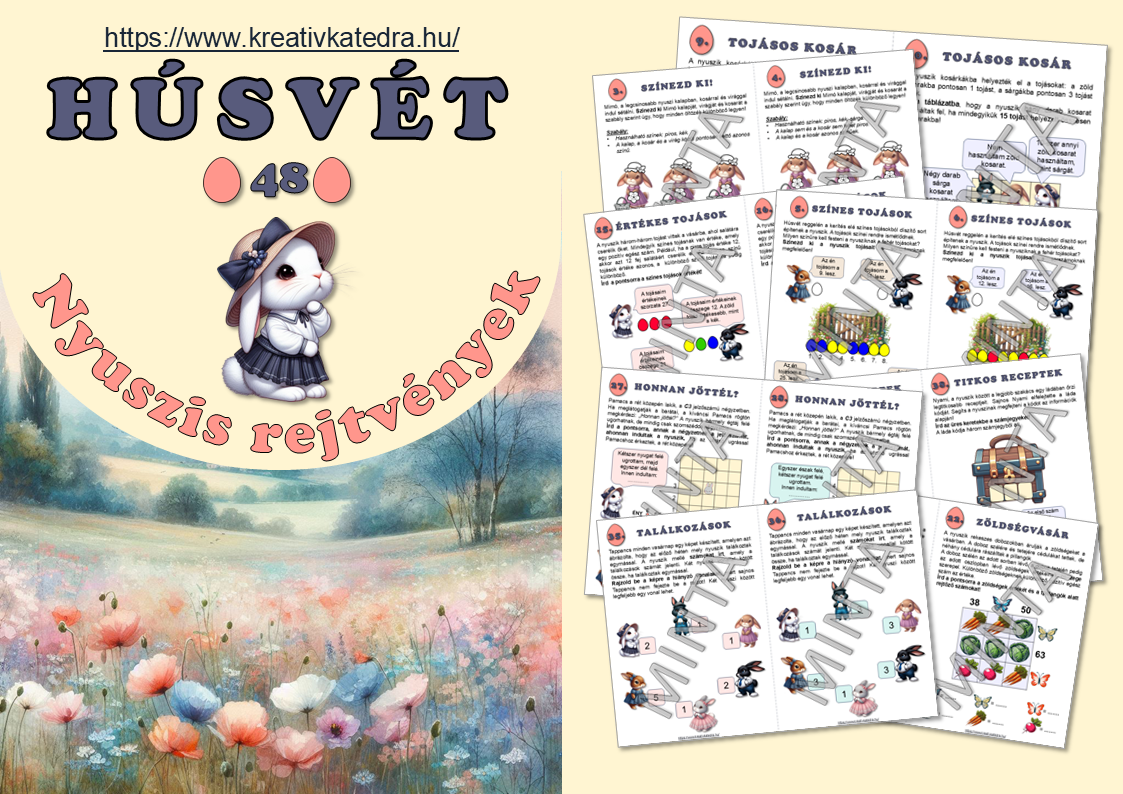A nyomtatható pdf-ben 12-féle vidám, nyuszis rejtvény található, mindegyik fajtából négy darab.