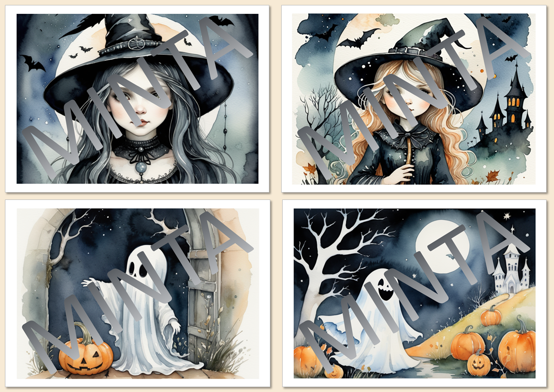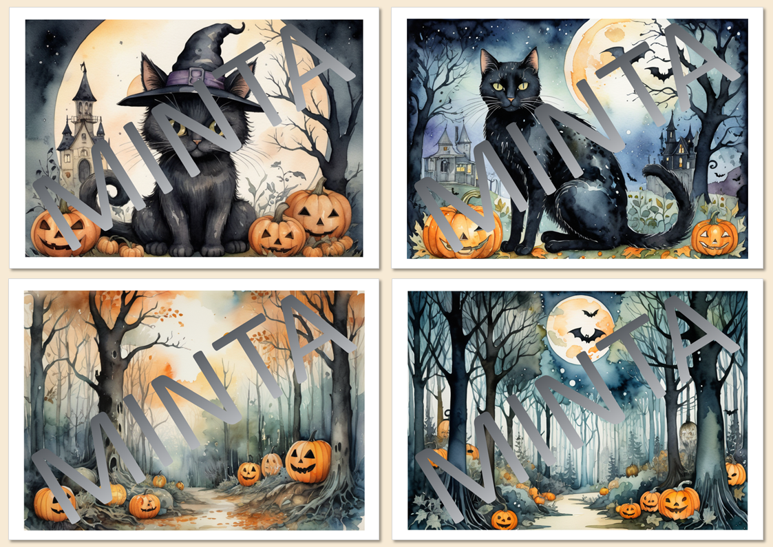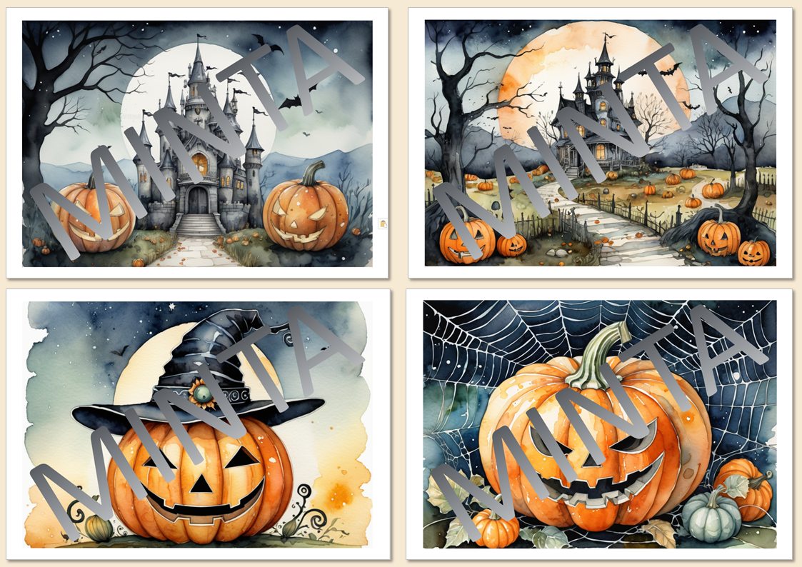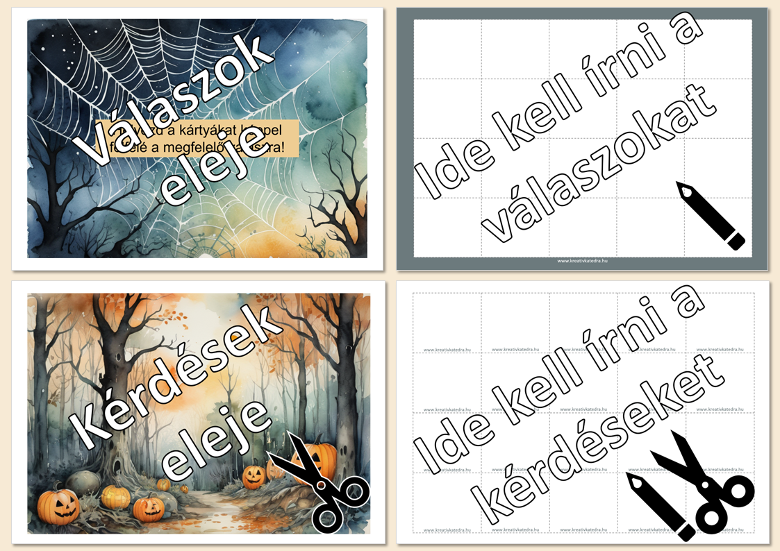 - 12 darab különböző "Halloween" témájú, A/4 méretű színes kép, a hátulja táblázatos - a kérdések, feladatok felírásához való.
