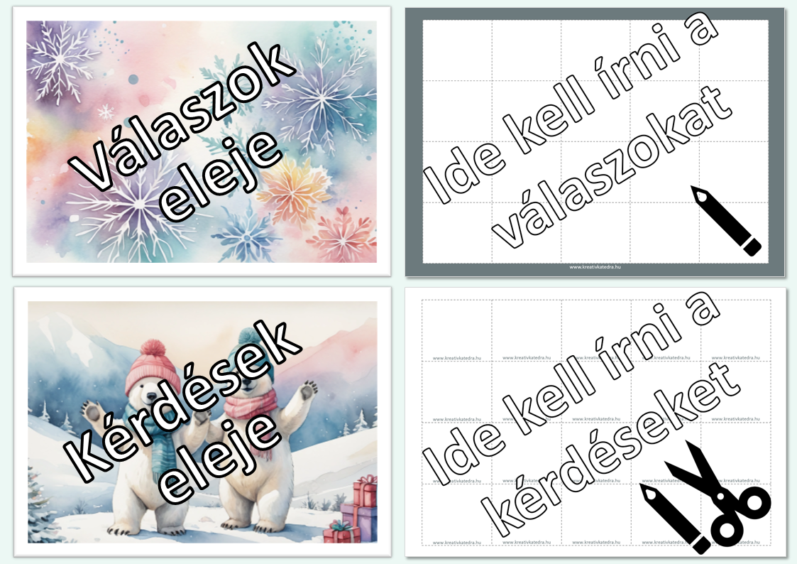 - 12 darab azonos, hópihés (csak a keret színében eltérő) A/4 méretű színes kép, a hátulja táblázatos - a válaszok, megoldások felírásához való. Ez a kép lesz a kirakó alapja.